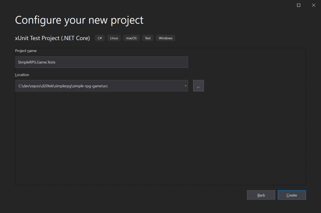 Then enter the appropriate project name (SimpleRPG.Game.Tests) in the next page of the wizard, and click the Create button. By convention, I use the same name as the original project with “.Tests” appended to it. This makes it easy to see which test projects that are associated with which source project.