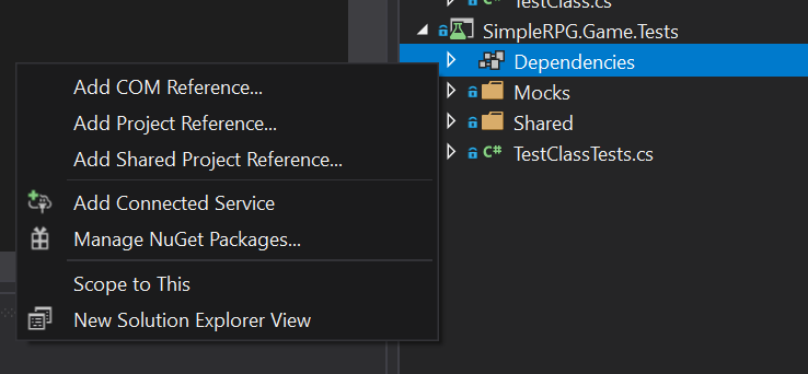 Next, we need to reference the game project in our tests. This allows our test project to access public types in the game project. Right click on the Dependencies folder in the test project, and then select Add Project Reference.