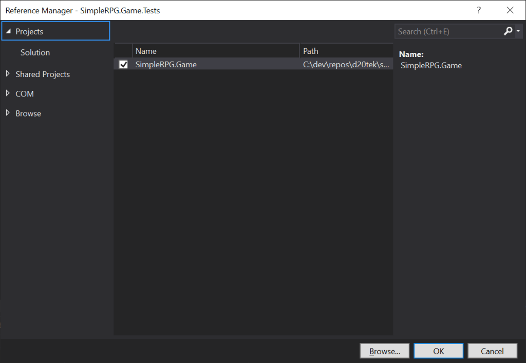 We are going to want to create tests to validate the features of our game. So let’s add a unit test project to our simple-rpg-game solution.