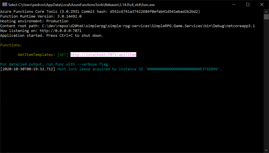 This will launch a console window for the Azure Functions runtime.