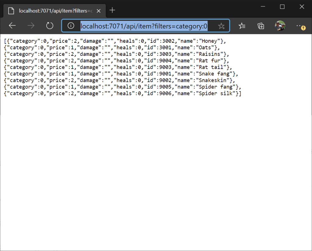If we run a filtered query for miscellaneous items sorted by name (http://localhost:7071/api/item?filters=category:0), we will get the following: