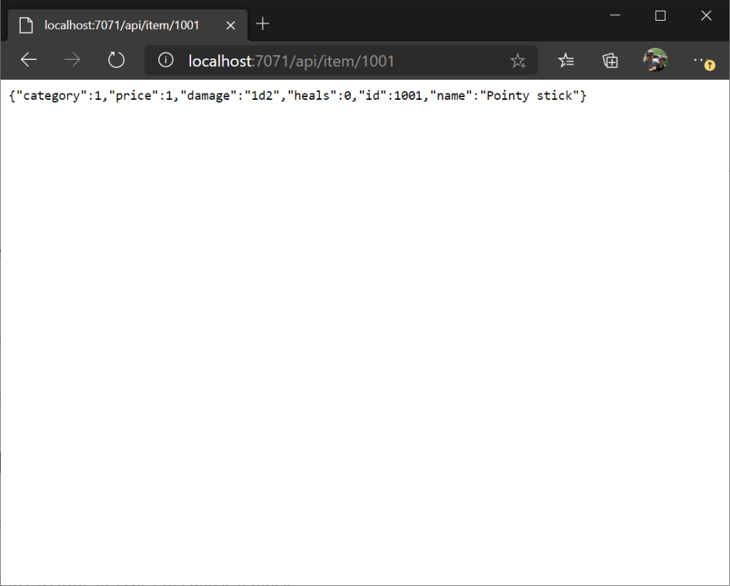 And if we query for a single ItemTemplate with the id:1001 (https://localhost:7071/api/item/1001), then we will see the following result: