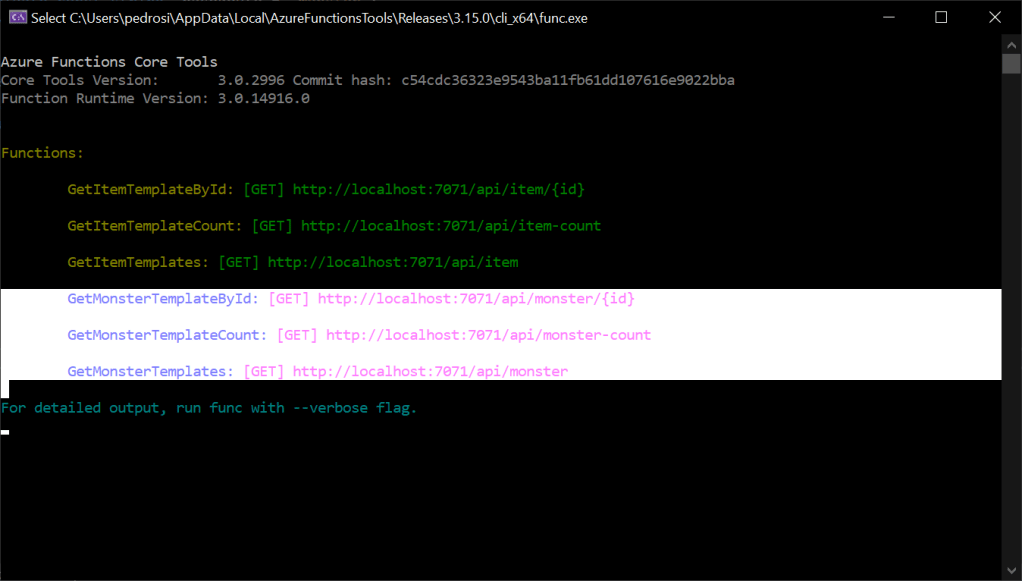 With our service code complete, we can build and run our Azure Functions. After a clean build, we will get the following Azure Functions runtime window. Notice that there are 3 new service methods available and their new endpoint URIs.