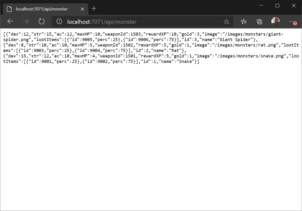 Now we can display the following URL in the browser to see all MonsterTemplates returned by our service: http://localhost:7071/api/monster (note the localhost port will be different for your instance).