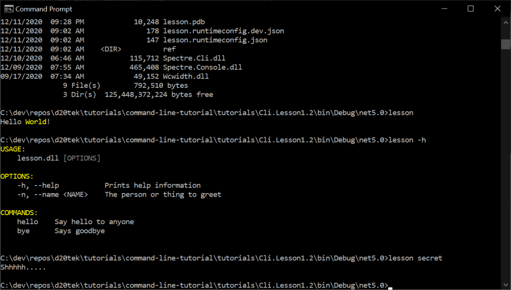 But when we use the command as a command-line argument, that command is processed and its Execute method is called: lesson secret.