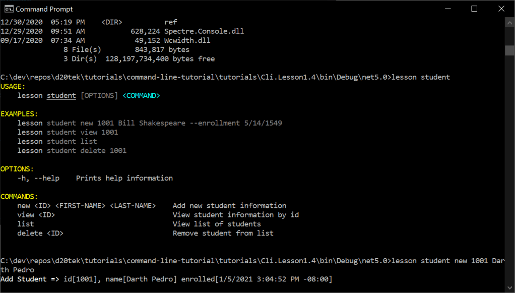 .WithExample(new[] { "student", "new", "1001", "Bill", "Shakespeare", "--enrollment", "5/14/1549" });