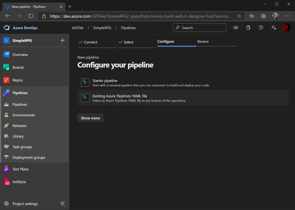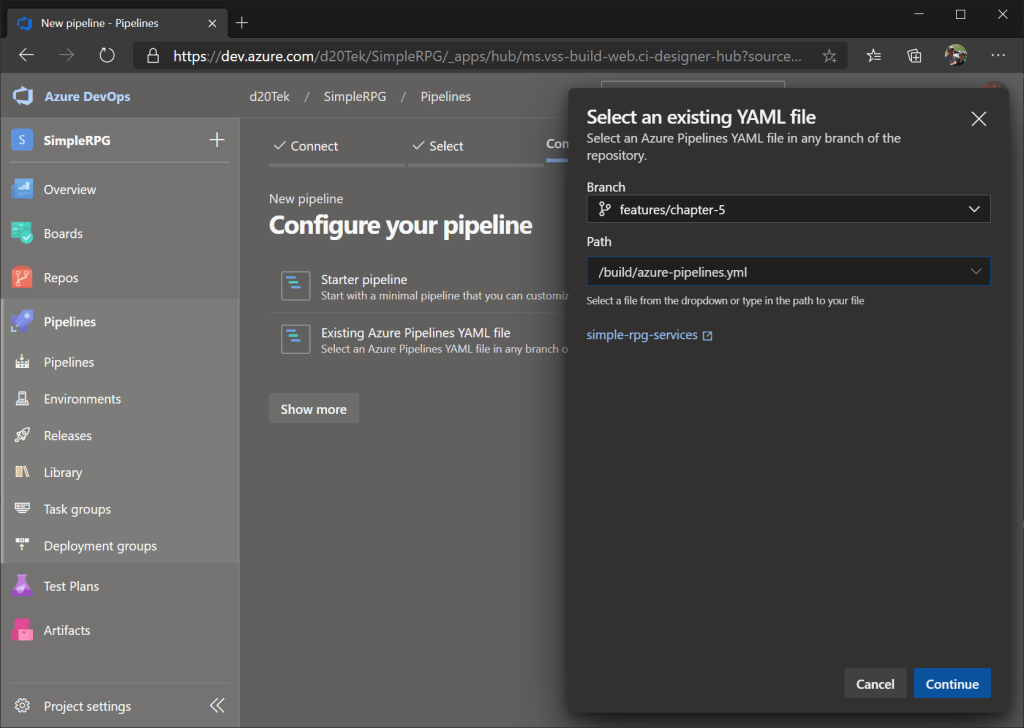- Select our repo from the Azure Repos list — simple-rpg-services.