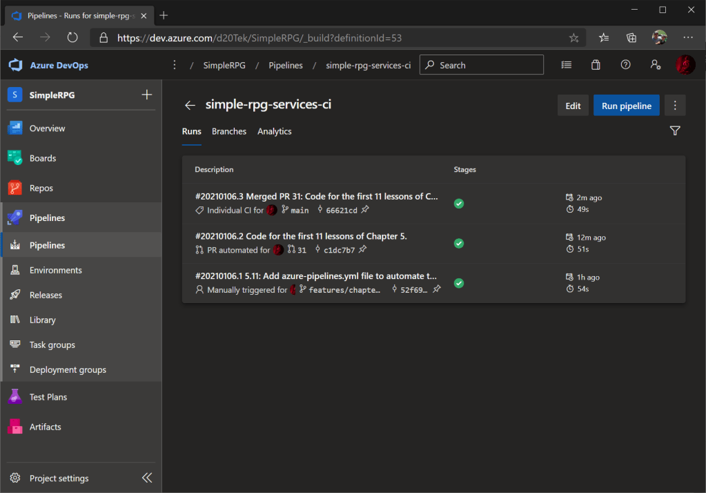 Early in our development of the SimpleRPG game project, we set up a continuous integration pipeline to automate our build with every repo check-in. Now we are going to set up another pipeline for our game services. Since the services are in their own repository and solution and have different deployment requirements, we will need to define a new pipeline.