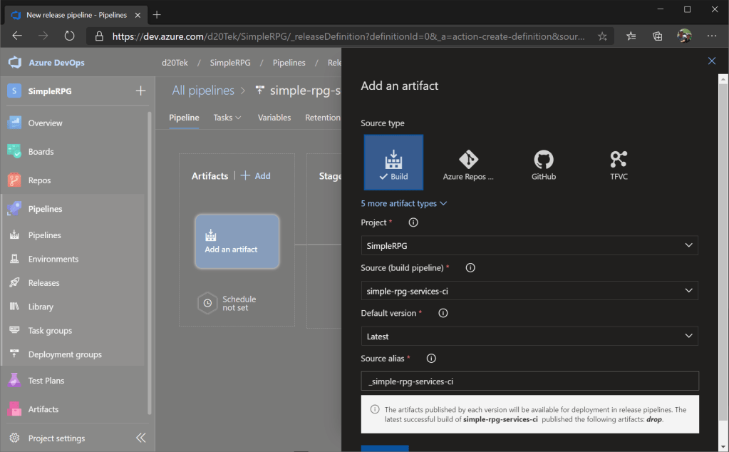 6. In the flyout, select the ‘Build’ option at the top. Then in the ‘Source’ combo-box, pick our service build pipeline (simple-rpg-services-ci). The rest of the settings can remain the default. Finally, click the ‘Add’ button at the bottom of the page.