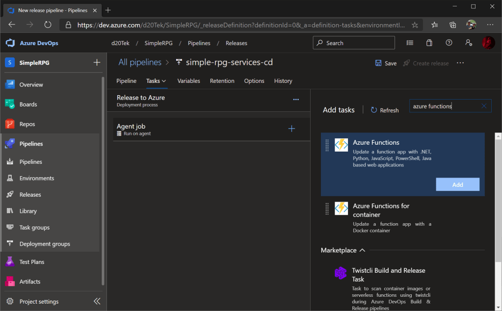 6. Click the ‘+’ button on the Agent job and then search for ‘Azure Functions App’ in the task list flyout. Then click the ‘Add’ button to place it in the pipeline.