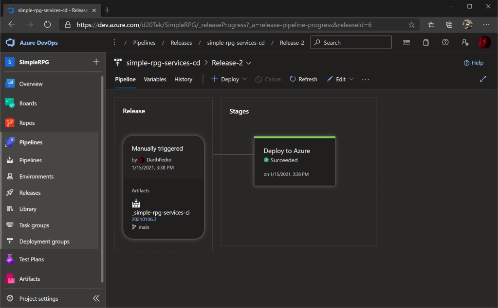 This release pipeline will give us the ability to create releases to our production environment for whichever build we wish. With the action of creating a new release in Azure DevOps, we get our latest service code released to Azure.