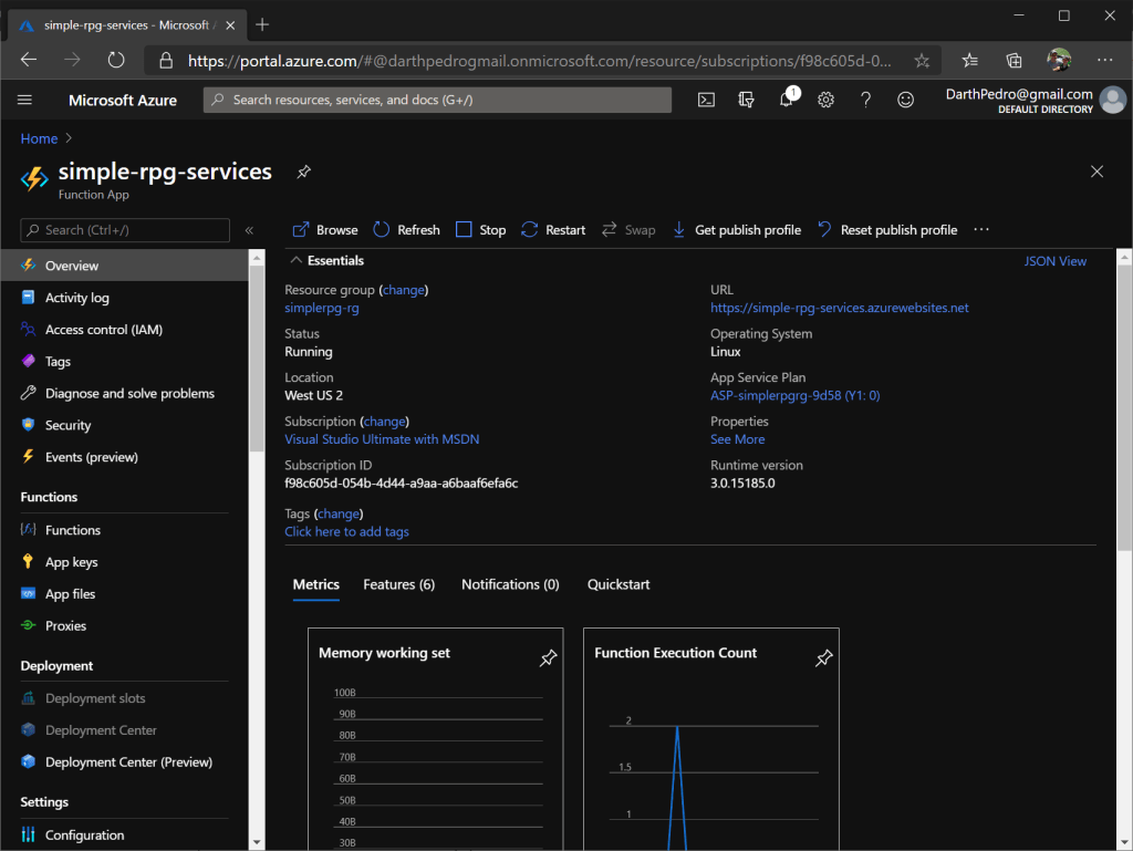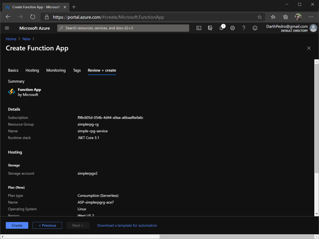 - For ‘Function App name’, type ‘simple-rpg-services’. This needs to be unique and will become part of our Function App url.