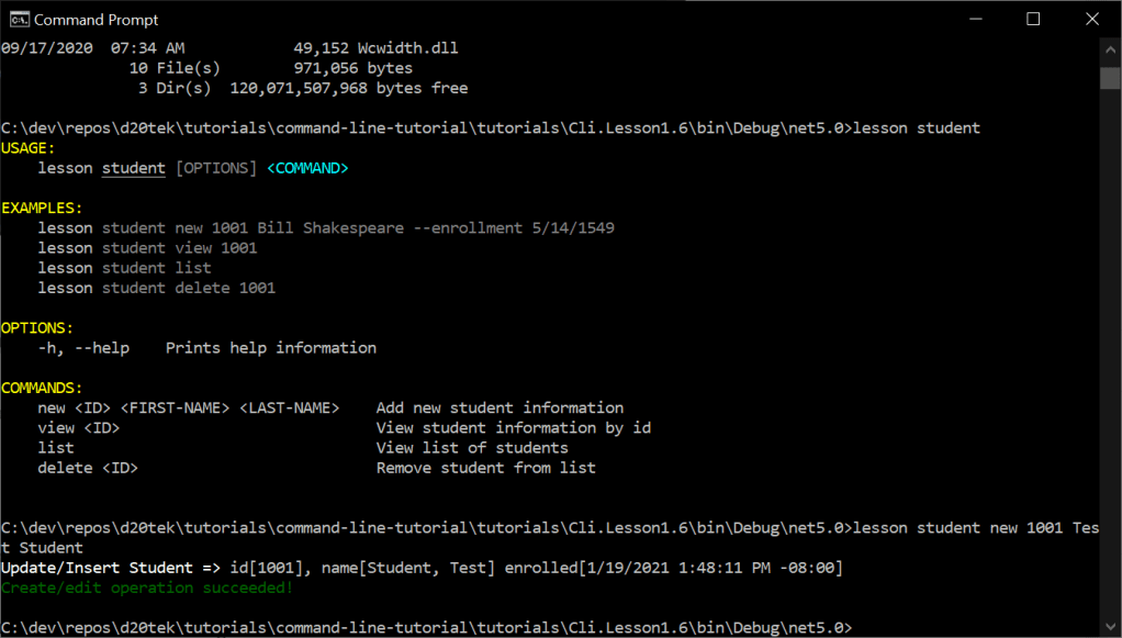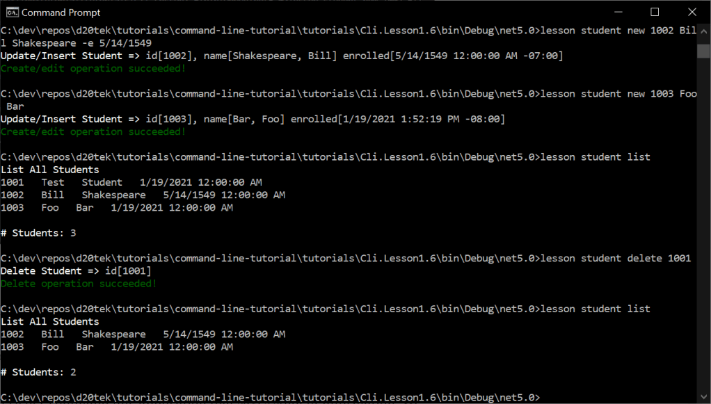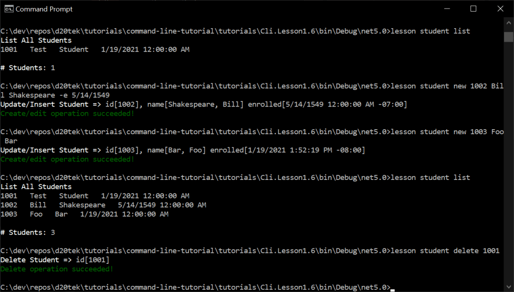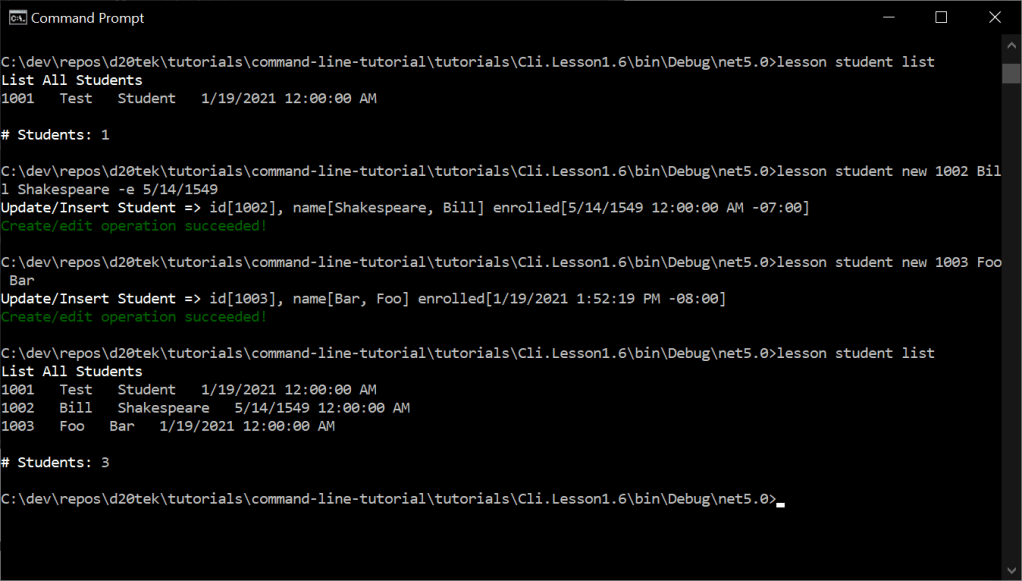 With these code changes in place, we are ready to build again. We now have a command line app that lets users view and edit students. And these changes are persisted in a local data file. Our command-line app is getting more and more useful.