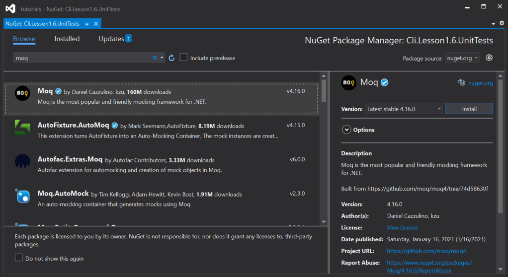 Let’s install the Moq package into our project: