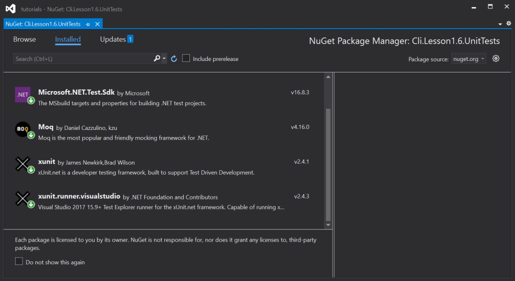 We now have our xUnit test project, which will hold all of our tests. If we look at the project’s ‘Dependencies’ node in the Solution Explorer and launch the NuGet manager, we will see that it comes with two package references: xunit and xunit.runner.visualstudio. These packages are what adds xUnit support to this project.