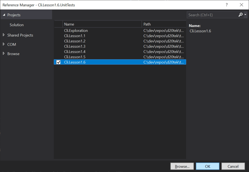 Before we can start writing tests for the code in Cli.Lesson1.6 project, we need to add a reference to it in our test project.