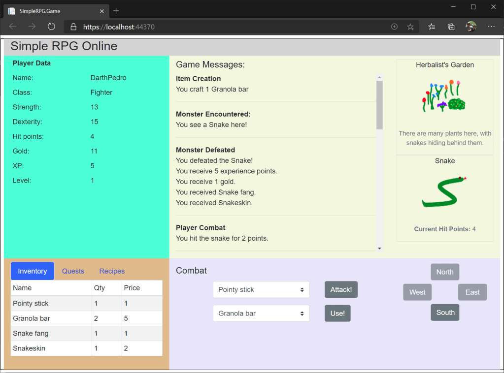 Let’s try to run the game locally again. This time, the game should load up to our familiar screen. We can see our Pointy Stick in the weapon dropdown and items in our inventory. So we successfully retrieved those items from our game services. Let’s go kill a few snakes to make sure our game still works!