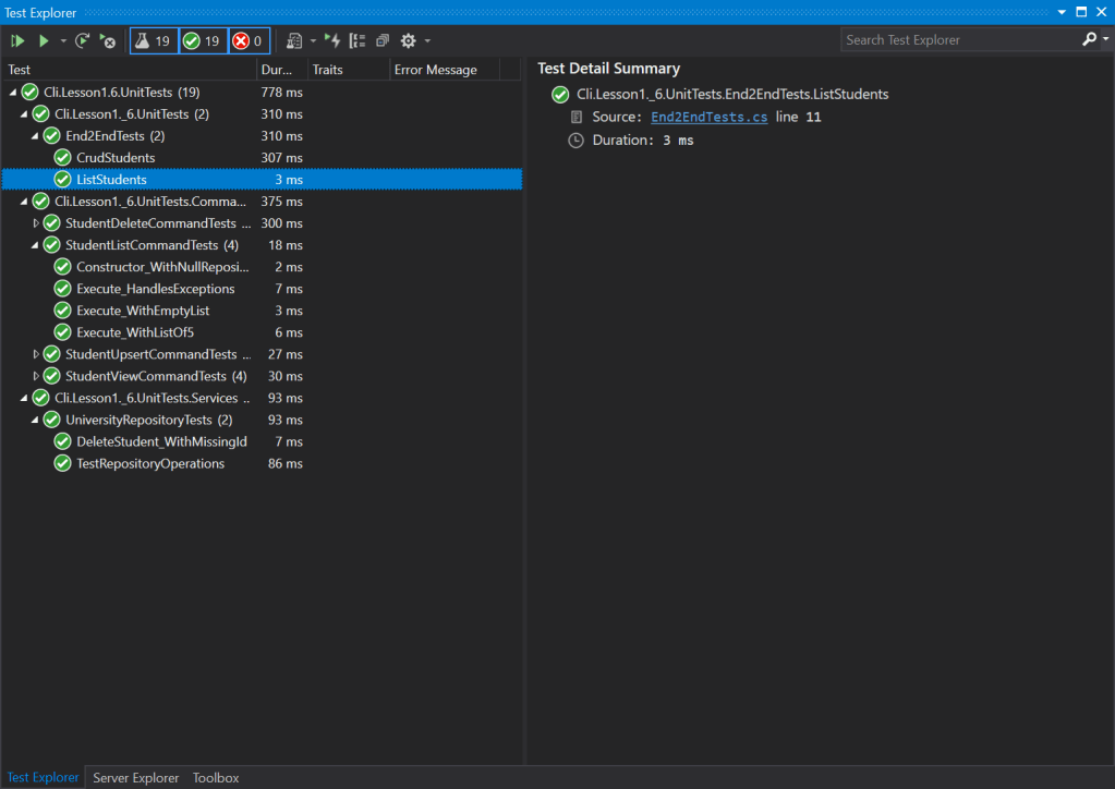 This covers our integration/end-to-end tests for our console application. We now have a set of 19 tests that cover all of our unit test and end-to-end test scenarios. If we had more commands or very complex logic in those commands, we would need many more tests to cover everything. But this is a good starting point to understand how to build tests for console applications.