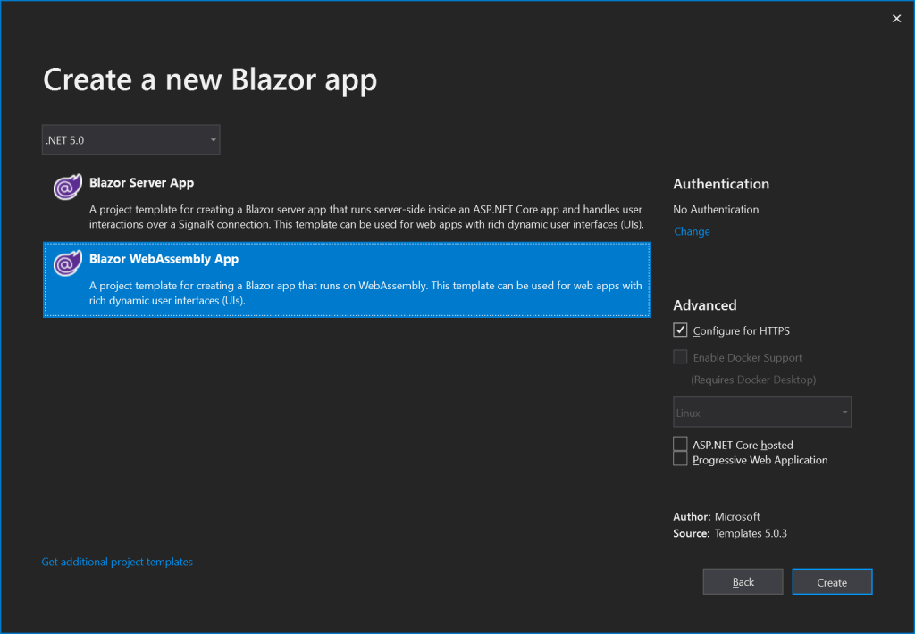 - Optionally, check the ‘ASP.NET Core hosted’ item when you will host your Blazor project in an ASP.NET Core hosted environment. This is one possible hosting model, but we can also host our Blazor WebAssembly as a static website.