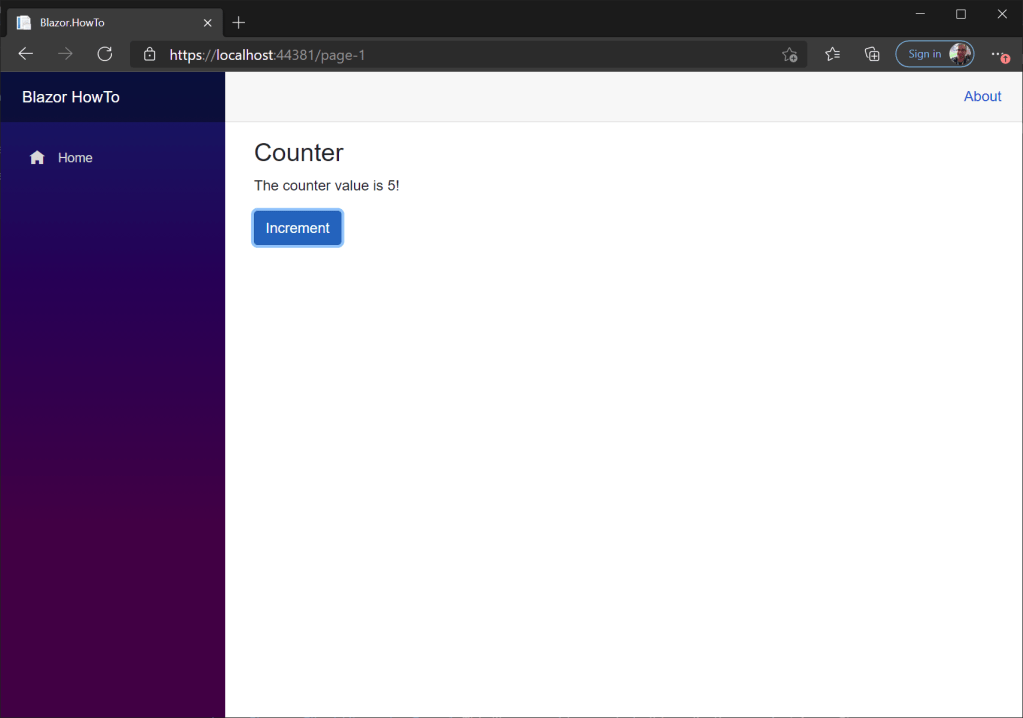 We can now build and run our new code (Ctrl+F5) to get the page below. If we click the button a few times, we will see the counter update.