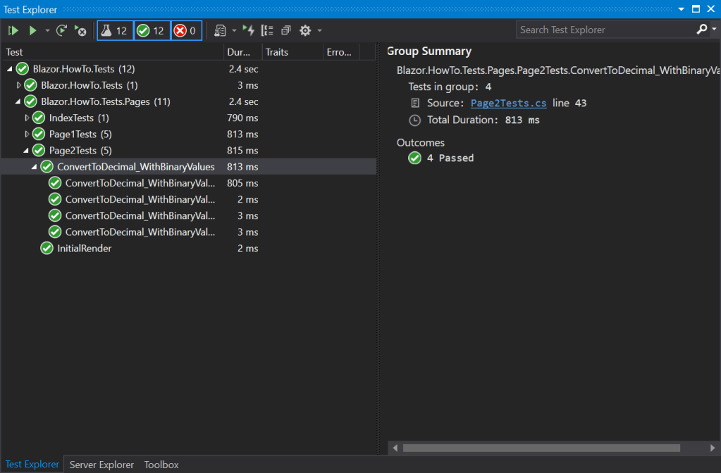 This is all of the test cases required to validate our conversion logic. Let’s build both projects and run the tests. All of the tests should pass and the Test Explorer should show the [Theory] variations as another level deep in the tree.