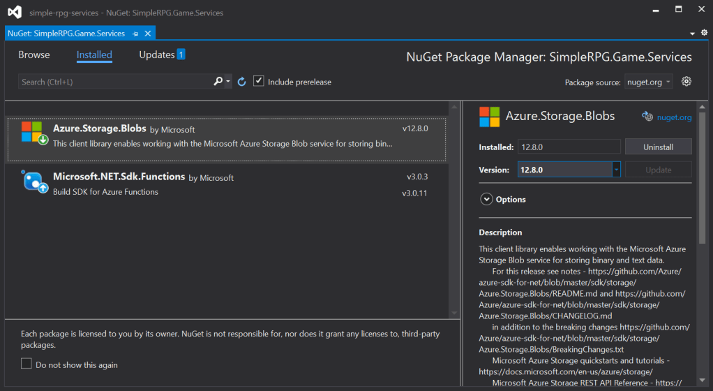 - Install the ‘Azure.Storage.Blobs’ NuGet package in the SimpleRPG.Game.Services project. This package is a client library that integrates with the Azure Blob Services APIs.