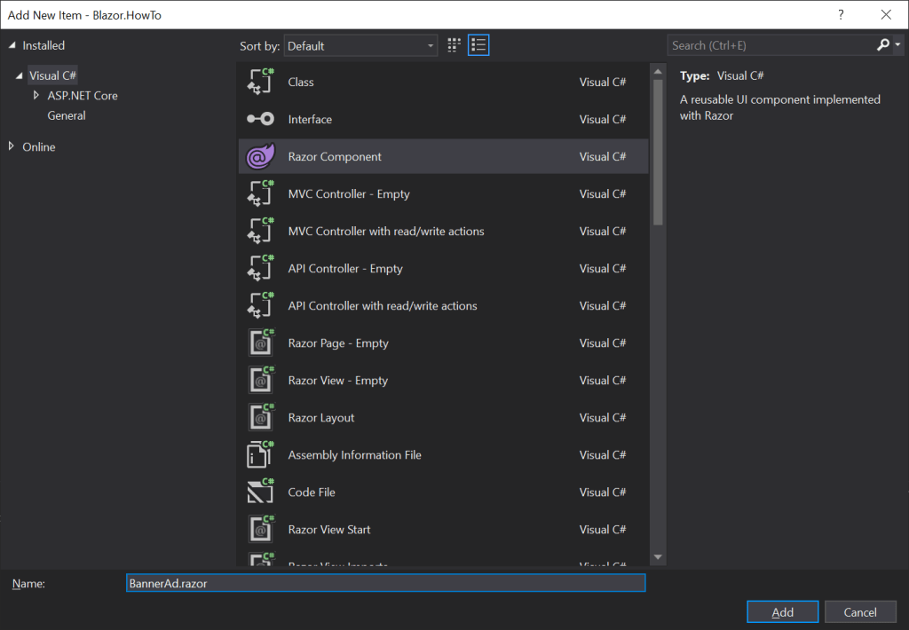 - Select the ‘Add > Razor Component’ menu item.