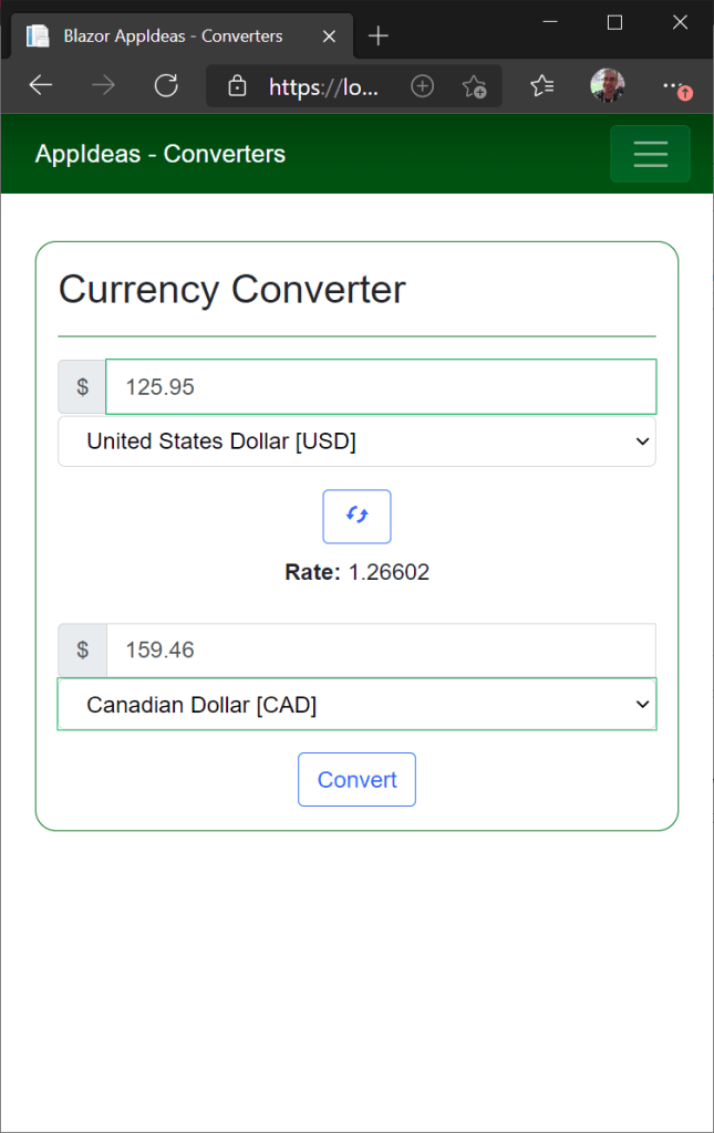With all of this code completed, we can build and run the project. If we navigate to the Currency Converter, we can try some conversions.