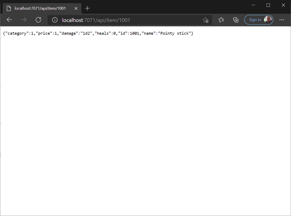 2. Now call the service specifying the blob repository type (localhost:7071/api/item/1001?repo=blob). Notice that the item name has “blob” in its name, so that we can distinguish its source.