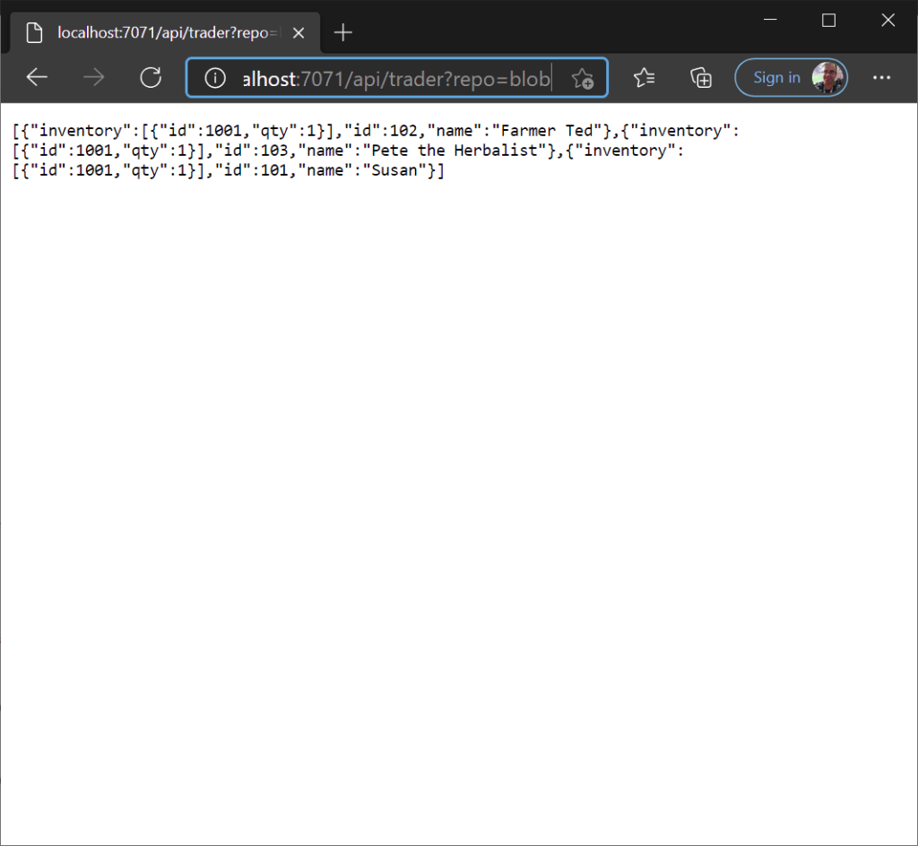 4. Call GetTraderTemplates with blob repository type to get the same list (localhost:7071/api/trader?repo=blob).