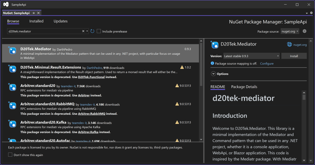 Or to install the package in the Visual Studio UI, go to the Tools menu > “Manage NuGet Packages”. Then, search for D20Tek.Mediator, and install the latest version of the package from there.