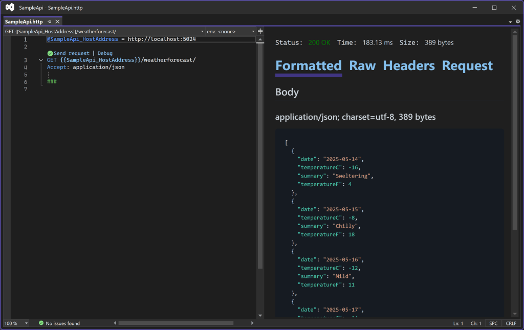 With all of these changes made, the project is ready to run. Press F5 to run the SampleApi service. Then, send a GET request to the service, and you will see the following results: